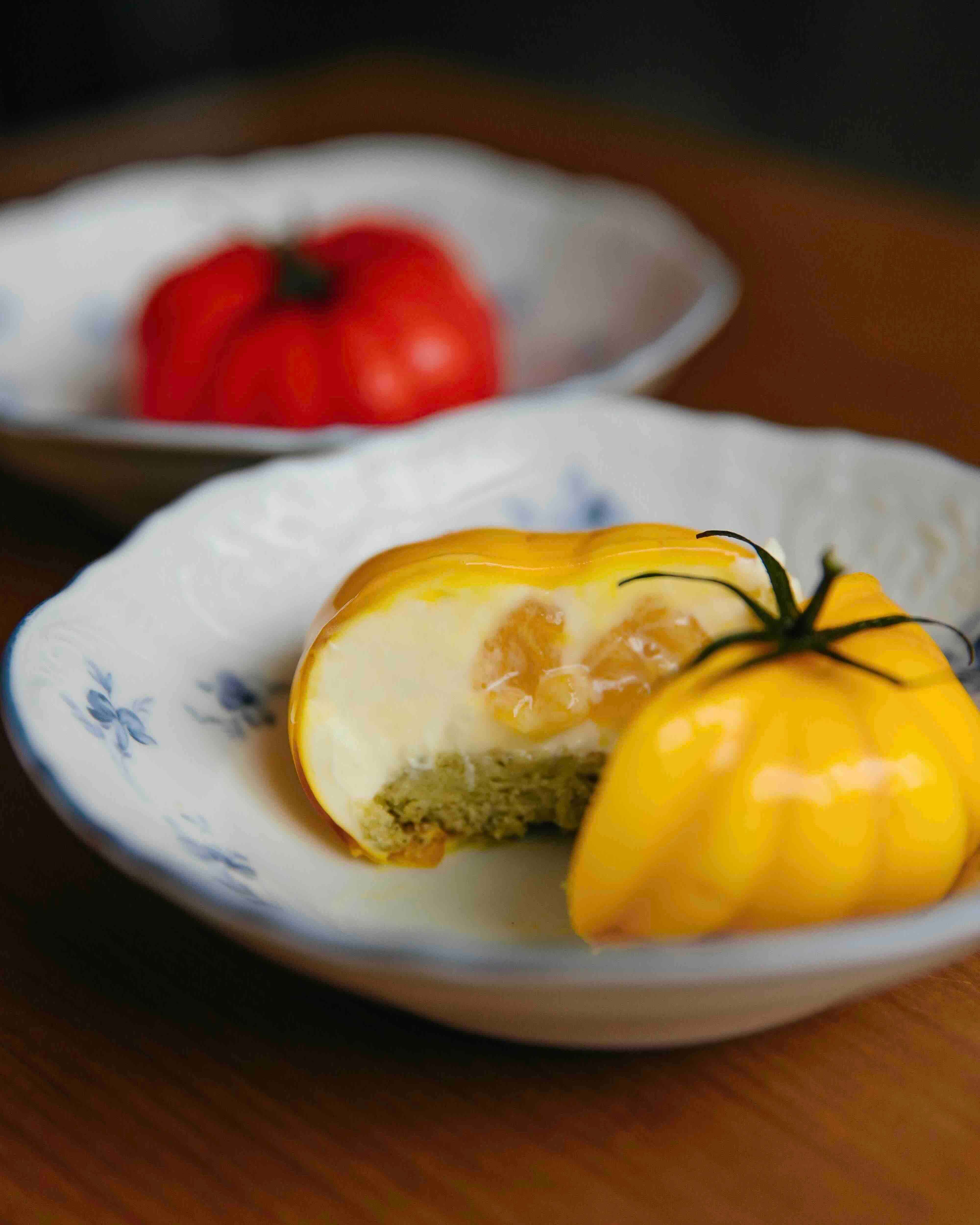 А теперь — десерт. Ugly tomato — глянцевый томат в зеркальной глазури, внутри которого прячется розмариновый мусс, персиково-апельсиновая начинка и базиликовый бисквит. Да, это всё съедобно, и да — невероятно вкусно.