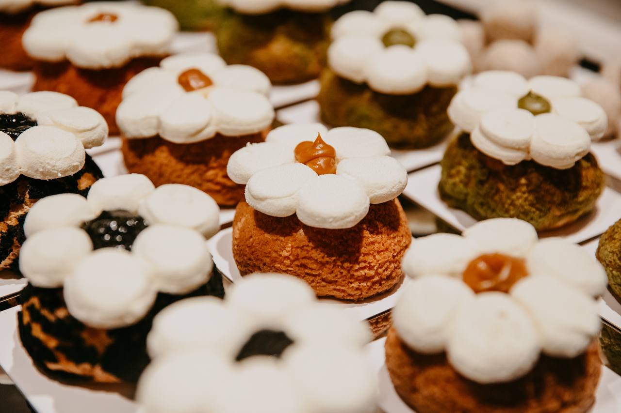 Пространство оформлено в духе «успокойся и закажи матча»: мягкие тона, спокойные линии, много света. А вот десерты — настоящая поп-звезда витрины. Тут тебе муссовые пирожные, пончики из воздушного теста и цветочные шу с начинками, на которые хочется сначала посмотреть, а потом всё же съесть. Или хотя бы сделать пару сторис.