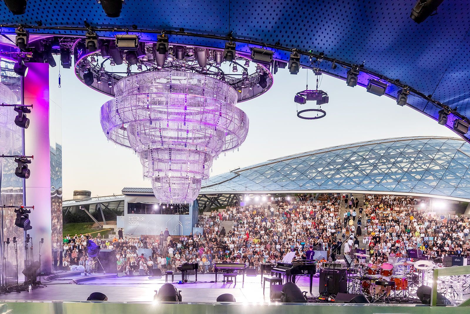 На главной площадке парка возвели сцену с огромными экранами и технологичной люстрой — смотришь и не веришь, что всё это посреди города, а не на гастролях где-нибудь в Европе. Балет сопровождает живой оркестр, и отрывки из «Лебединого озера» или «Шехерезады» звучат так, будто ты сидишь в лучших ложах театра.