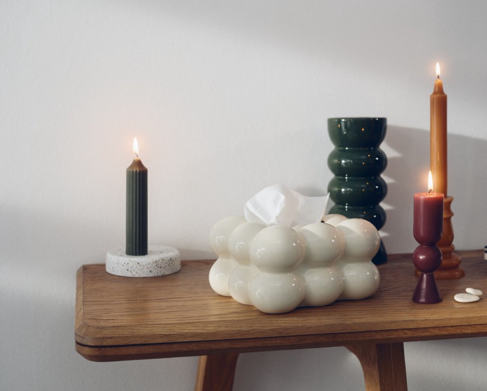 В ноябре добавится новогодняя линейка — ёлочные игрушки, праздничные свечи, сервировка и декор. Все позиции разработаны внутренней командой Sela.