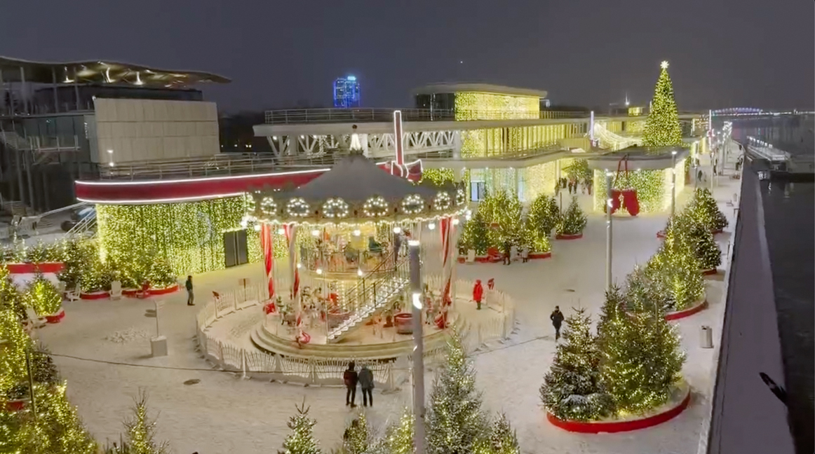 Прямо сейчас на набережной — лес из наряженных ёлок, арт-объекты и барельеф по эскизам Дейнеки, знакомый по рендерам. Работает бесплатная детская карусель, стоят временные палатки с напитками и стритфудом. Всё это выглядит как мягкий новогодний фестиваль без перегруза — скорее фон для прогулки, чем повод толпиться.