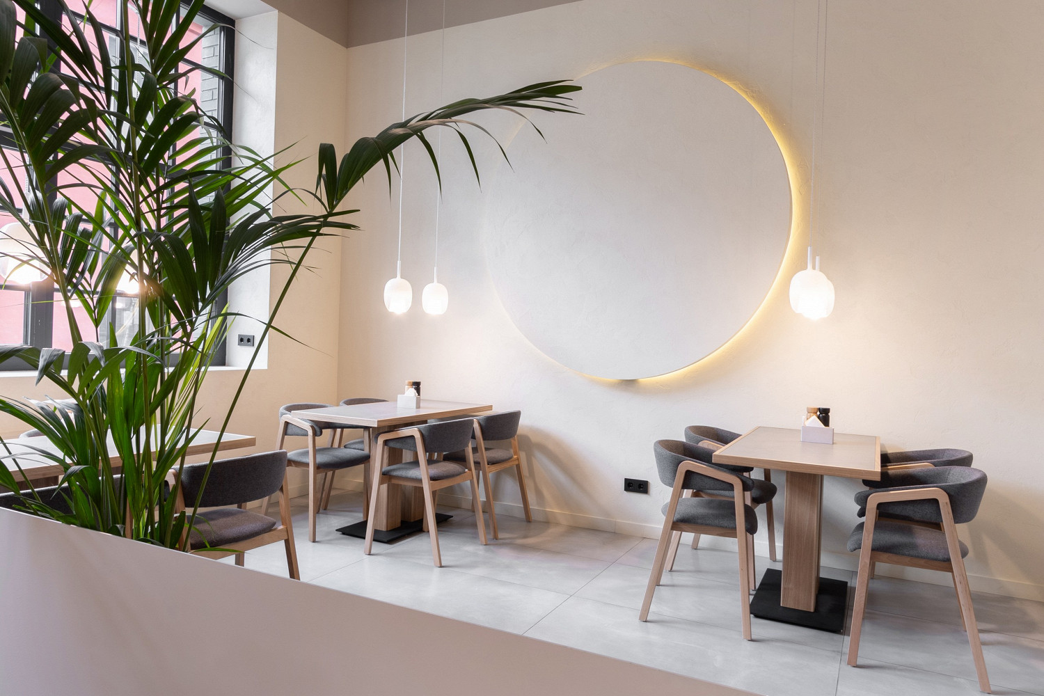 Минимализм и стекло: светлое пространство и спокойный интерьер. Столики — просторные, розетки — под рукой. Подойдёт тем, кто любит работать на фоне балийского вайба и нейтрального гула.